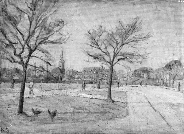 Peter Hansen made this painting, *Havnefogeden, rebslageren og skipperen. "Najaden" krydser ind*, with oil on canvas, but when? We don't know! It's a picture of three men, and what looks like a harbour. The tones are muted, which gives it the feel of a memory, or something half-glimpsed. The paint is applied in loose strokes, which is especially visible in the bare trees and the wall behind the bench. See how they create a network of lines that are almost abstract? Look at the brushstrokes on the building. They are chunky and uneven. I love how the artist doesn’t try to smooth things out or hide the process. It feels immediate, like Hansen wanted to capture a fleeting moment, which is perhaps related to the way that someone like Manet worked. It reminds me that painting is always a conversation, a back-and-forth between the artist and the materials, and a way of seeing.
