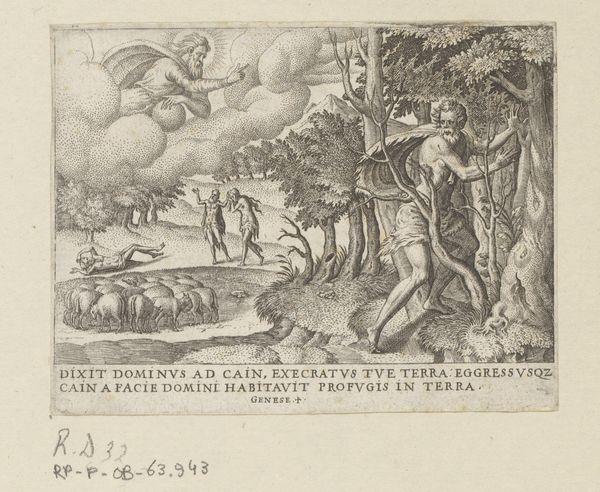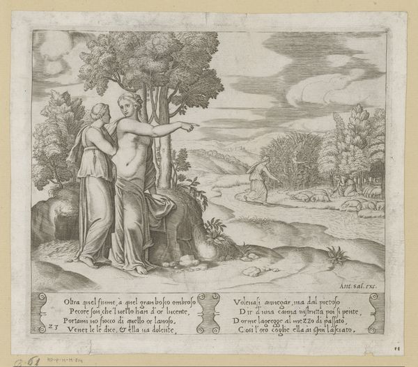 This engraving, titled "Amor vlucht voor Psyche," or "Cupid Flees from Psyche," was made by the Master of the Dice, though the exact date remains unknown. The print depicts a moment of crisis taken from Apuleius's narrative where Psyche betrays Amor's trust, leading to his departure. During the Renaissance, such allegories were often used to explore the relationship between reason and emotion. Consider how the image, with its focus on emotional turmoil, reflects societal expectations around love, trust, and gender roles. Psyche is presented as a figure of remorse, while Cupid literally flees the scene, bow in hand. The poem beneath the image speaks of despair and a longing for hope, emotions perhaps mirroring the personal experiences of individuals navigating the complex societal mores of the time. The landscape is not merely a backdrop but a reflection of inner turmoil. This piece offers a glimpse into the complex interplay between classical mythology, Renaissance ideals, and personal struggles with love and trust, mirroring questions that still echo today.