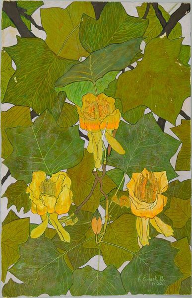 Curator: Up next is a luminous watercolor piece by Georgia O'Keeffe called "Squash Blossoms I." It depicts exactly what the name suggests. Editor: Well, that’s putting it mildly. It's overwhelmingly…yellow. Radiating outwards, sunlight captured on paper. But there's an intensity to the composition—almost like the flower is pushing against the boundaries of the page, threatening to burst out. Curator: That's characteristic of O'Keeffe's technique. The way she crops her subjects gives them a monumental presence. It transforms the everyday—in this case, a simple squash blossom—into something almost otherworldly. O'Keeffe had this deep interest in botany. She'd pick a subject and depict them so that people have to really stop and consider this familiar shape or color. Editor: True, true. You know, O'Keeffe always struck me as a cultural pioneer who wrestled with gender expectations and embraced an independent lifestyle. Curator: Absolutely! She forged her own path in a male-dominated art world. She used New Mexico, where she chose to live, to make statements about the country as it was growing. These details about where an artist chooses to make their art help connect to certain communities. Editor: Exactly! It’s hard to remove art from the context it was produced within, and that makes me ask questions about whose culture or nature it represents. Curator: You got it! What she captured, the way the piece lives between reality and abstraction—it’s a stunning work. It deserves consideration. Editor: Agreed. Maybe the painting's not just about capturing botanical accuracy, but about celebrating the potential for art to push at the borders of identity. Curator: Beautifully said!