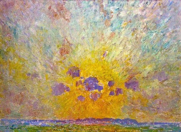 Curator: Good morning. Let's discuss this interesting pastel work. It is titled "Sunrise on the Sea", by Camille Pissarro, dating from 1883. Editor: Immediately, what strikes me is the contrast. A bursting, almost violent sun offset by the solid, stoic cliff face. There is also something photographic about it - maybe the cropping? Curator: The Impressionists’ use of plein-air certainly echoes a pre-photographic attempt at documenting "reality." Speaking of structure, note the radical division of space, almost a flattened plane. Pissarro contrasts the dynamism of the sunrise, achieved through radiating lines, against the solid verticality of the cliff on the right. It pushes the viewer's eye from one formal extreme to another. Editor: That contrast you mention has real socio-political overtones, don't you think? This period in France, barely a decade after the Franco-Prussian War. That defiant cliff… the land enduring after turmoil, whilst a bright new dawn, bringing hope, rises? It's like Pissarro offering subtle encouragement during economic hardship. Curator: I appreciate that interpretation. Yet I wonder, if it isn't so literal. The textures themselves play a key role: the almost chaotic strokes near the waves against the regimented lines suggesting the cliff's rock face, these engage my reading even without cultural narratives. What does this inherent clash communicate to you, visually? Editor: True, but context always matters. In those times, coastal scenes also depicted the rising importance of sea resorts and tourism—escape for the bourgeoise class, enabled by modern train lines that reached these towns, no doubt influencing Pissarro. Perhaps he wanted to touch on those rising trends. Curator: You believe it to be social commentary then? Intriguing. I lean towards interpreting the rising sun, not merely as symbolic, but as a structural tool, which provides contrast and direction within this very intriguing and captivating composition. Editor: In the end, whatever its intrinsic composition is, and the visual cues that provide a direction within the work, it reflects how art plays such a critical role in the documentation, reflection and ultimately, influence of public consciousness. Curator: Well said. Its delicate and forceful construction makes it so unforgettable.