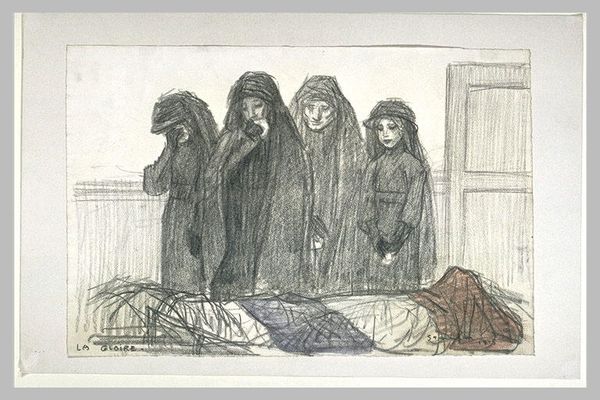 Curator: Here we have François Saint Bonvin’s small watercolor, "Praying for the Dead," housed here at the Harvard Art Museums. Editor: The first thing that strikes me is the somber mood, a kind of quiet desperation captured in these washes of ink. It feels almost like a memory fading. Curator: Absolutely. Bonvin was interested in exploring themes of mortality, and the shrouded figures tell a story of ritual and mourning, and remind me of the ever-present memento mori tradition. Editor: The stark contrast between the white of the paper and the deep blacks emphasizes that feeling of loss. Look at the way he uses negative space around the praying figures to create a void. Curator: And the symbols, the crucifix there by the bedside, the bowed heads—they speak to the enduring power of faith in the face of death, a search for meaning when everything seems to be falling apart. Editor: Ultimately, it’s a powerful depiction of grief and resilience. It invites us to contemplate our own mortality and how we find solace in times of sorrow.