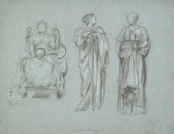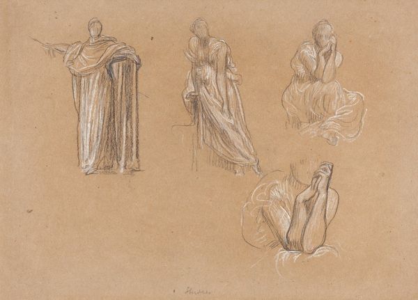 Curator: This is "A sheet of figure studies", a pencil drawing by Frederic Leighton. Editor: Immediately striking! There’s an understated energy in these figures, a tension created by the stark white of the page against the precise lines defining form and fabric. I’m particularly drawn to the implied movement within each figure, how the shading seems to anticipate each subsequent movement they might make. Curator: The sheet presents four figure sketches, each swathed in classical drapery. Leighton employs line to capture not just form, but also something about the psychology, the emotions simmering beneath the surface. Look, for example, at the figure with raised arms – an expression of anguish, perhaps, or fervent prayer. Editor: Agreed, the dynamic range created by the dramatic chiaroscuro definitely elicits a psychological reading! I am also quite interested in the negative space around the figures. Leighton lets areas recede into ambiguity while precisely rendering others, establishing a visual hierarchy, and suggesting, rather than stating, details about each body. Curator: Precisely! Notice too the recurrence of the drape, serving not only as clothing but as a carrier of symbolism. Drapes shield, protect, transform identity; in Western art, heavy cloths carry histories, memories, societal conventions and psychological drama that speak without the need for more direct figuration. Leighton uses those symbolic meanings well. Editor: These figures remind me of neoclassical sculptures rendered two-dimensionally! I find it really satisfying how these rough drawings use their lack of refinement to build energy, which seems somewhat paradoxical. Even if intended simply as a practice piece, it shows how skilled he was. Curator: Leighton clearly intended for them to feel weighty, grounded within a specific emotional reality. His handling of pencil emphasizes his intent and reveals just what can be done using the classical, historical associations behind his simple choice of pencil and form. Editor: So, what at first seems like an exercise in technical prowess then reveals layers of narrative and deeper psychological import through compositional strategies that elevate the ordinary. Curator: An important piece in grasping Leighton’s wider vision, I think. Editor: Absolutely. And a great case study in the visual power of constraint and intention.