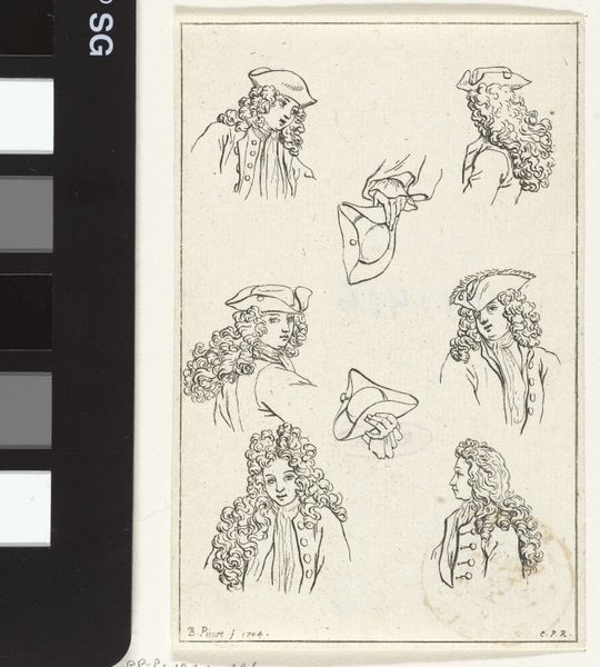 Curator: This work, currently held at the Rijksmuseum, is entitled "Houdingen van mannenhoofden en manieren om een hoed te dragen"—"Attitudes of men's heads and ways of wearing a hat." It's a drawing done in 1704 by Bernard Picart, using pen and ink. Editor: Oh, I'm immediately struck by the wigs! So much hair, and the hats perched precariously on top. There's something almost comical about it, but elegant at the same time. Curator: Absolutely. You know, these aren't just idle doodles. These head studies would have been used for a variety of purposes, everything from preparatory drawings for larger paintings to model books, providing examples for other artists or even for craftsmen designing clothing. Editor: So, it’s partly about codifying a certain masculine ideal, right? The elaborate wigs, the tilted hats – all signifiers of status and power. And who gets to participate in that performance? The obvious hierarchies implicit in the male gaze are on full display here. Curator: I find it interesting that Picart's rendering really elevates something seemingly simple—hat-wearing—to the realm of high art. It asks us to consider how even the most mundane aspects of dress can be loaded with meaning. I mean, each slight adjustment to the tilt of a hat conveys a specific message, a mood, a persona. Editor: Indeed. Look how the hairstyles themselves frame and sometimes almost consume the faces. The faces become secondary, almost like afterthoughts. It calls to question whether these portraits are really about the individual or rather about prescribed displays of masculinity within the confines of the 18th century elite. It makes me consider access and agency then, and the many contemporary implications of social restrictions today. Curator: Yes. The subtle nuances Picart captures speak to the larger theatricality of court life at the time, and how much of identity was curated through carefully chosen accessories and mannerisms. Editor: It really speaks to the enduring human fascination with identity. Picart gives us such intimate detail that really prompts us to think of gender as both deeply individual, and highly policed. Curator: A delightful little study of human identity—how fascinating! Editor: Provocative thoughts, even after all this time!
