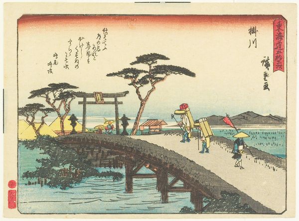 Curator: This work, "Well, Trees, Houses, People, Ducks on River," is a woodblock print created by Utagawa Hiroshige in the 19th century. It beautifully captures a winter scene. Editor: It feels surprisingly tranquil given all that's happening. The composition is serene despite the detail of the people and ducks! Curator: Absolutely. Hiroshige was a master of ukiyo-e, a genre deeply rooted in depicting everyday life and landscapes, often shaping public perceptions of famous places through carefully crafted images available widely to the merchant classes of Edo-period Japan. Editor: What I immediately notice is the symbolic weight of the ducks. In many cultures, ducks symbolize adaptation and resourcefulness, their presence perhaps subtly emphasizing the ability of life to persist even in the cold grip of winter. They appear as both sustenance and sign of continuing life. Curator: That's insightful. Ukiyo-e prints weren't just personal artistic expressions; they were commercially driven artifacts that played a vital role in urban culture, reflecting and influencing popular taste through a distribution system accessible across society. These images became cultural shorthand, solidifying the importance of the artist and place shown. Editor: And this particular imagery -- a frozen river, stark against the warmth of the gathering people in the corner of the frame, speaks to perseverance, but it’s almost deceptive; the woodblock print softens what would otherwise feel bitter. Is that tension deliberate? Curator: That is definitely something Hiroshige achieves, yes. It speaks to the cultural drive toward tranquility while accepting everyday society's happenings, good or bad. This specific example does reveal a tension that seems embedded within urban social dynamics. Editor: This image lingers with me, revealing the many facets of living well in urbanity even under bleak circumstances, subtly conveyed by Hiroshige's genius. Curator: It serves as a poignant illustration of art shaping collective experience and memory.
