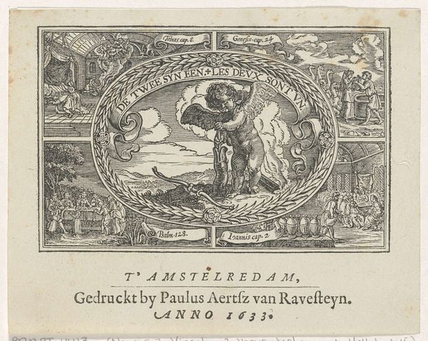 Editor: So, this engraving from 1716 is titled "Minerva en schrijvende vrouw," and it seems to be a book cover. I’m immediately drawn to the figures; they look like classical sculptures, but the landscape feels more like the Dutch Golden Age. What do you see in this piece? Curator: The prominent presence of Minerva certainly carries a heavy weight. As the Roman goddess of wisdom and strategic warfare, her image invokes intellect, skill, and justified conflict. We see her in conversation with what is literally translated as "writing woman." Given the Baroque and Dutch Golden Age context, Minerva, especially on a book cover, would signify something beyond martial prowess; this signifies knowledge and art's power. Editor: That’s fascinating! So, her presence gives the book an air of authority and knowledge? The landscape seems less symbolic; is that right? Curator: Ah, but landscape, particularly within the Dutch Golden Age, held its own symbolic power. Natural scenes were not merely aesthetic; they often reflected cultural identity and national pride. See how these women flank the framed vignette, perhaps suggesting a continuity between classical virtues and contemporary creativity. Are these two opposed in your mind? Editor: I hadn’t considered the women framing the view as part of a conversation between two worlds! But you’re right, their positioning changes how I read that landscape, too. The pursuit in the landscape connects with a cultural thread. It becomes another layer in their exchange. Curator: Indeed. Symbols layer meaning upon meaning. We understand a culture and its visual language, including where there is harmony, opposition, continuity, and change. Editor: This makes me see book covers—all artwork, really—as carriers of so much more than just their surface meaning. Curator: Precisely. And that's the lasting power of iconography; seeing art through the symbols gives depth.
