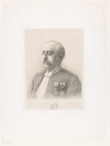 This is a portrait of François L'Hoëst, made by Joseph Edouard Van Looy. The portrait has a symmetrical composition, lending it a formal and balanced feel. The artist uses a limited tonal range to create depth, with the darker suit contrasting against the lighter background. This subtle contrast draws our eye to the details of the face. Van Looy’s work engages with semiotics, using signs and symbols to convey meaning. For instance, the meticulous rendering of L'Hoëst's mustache and the cut of his suit may signify his status and identity. The portrait invites ongoing interpretation, leaving us to consider how these formal elements communicate broader ideas about identity and representation.