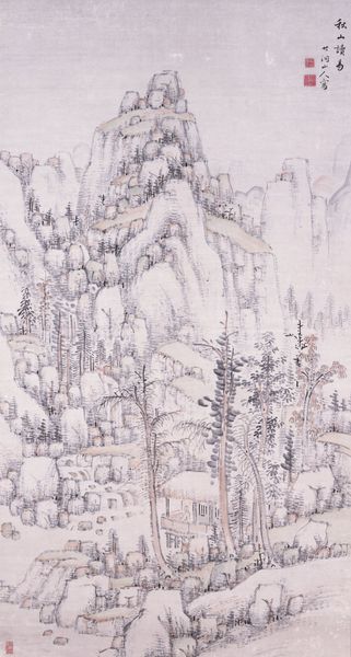 Ciurlionis created this work, entitled "Fugue," with watercolor and pencil on paper. The composition is immediately striking for its serene and ethereal quality. The use of muted, earthy tones creates a dreamlike landscape, divided horizontally into two mirrored sections. This symmetry evokes a sense of harmony, but also an unsettling doubling. The formal structure here isn't just representational; it’s deeply conceptual. Ciurlionis was fascinated by musical forms, and in a fugue, a musical theme is repeated and transformed. The mirrored landscape is not merely a visual effect; it's the artist's way of exploring themes of repetition and variation, of how elements can recur in different contexts to create new meanings. The subtle gradations of color and the delicate rendering of shapes destabilize any fixed reading, engaging with ideas about the fluidity of perception and the interconnectedness of visual and musical experience. It invites us to consider how art, like music, can transcend representation to explore the underlying structures of thought and feeling.
