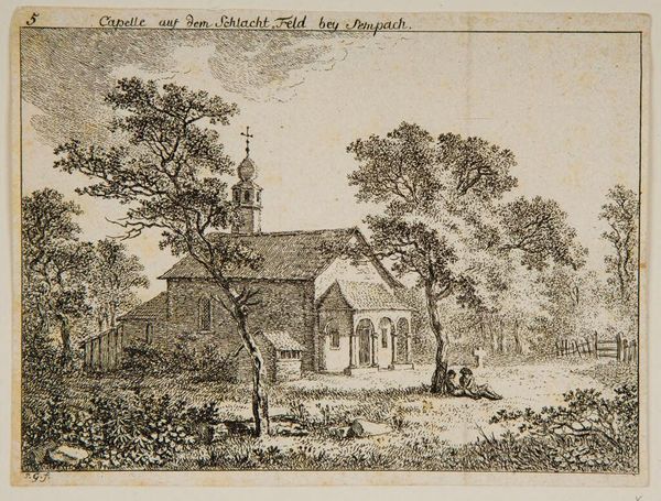 Curator: So, this engraving offers us a glimpse of the St. Agnes Convent in Utrecht. Abraham Rademaker created this artwork sometime between 1727 and 1733, though the scene depicts the year 1670, a bit of temporal playfulness on Rademaker's part, wouldn't you agree? Editor: It certainly feels…deliberate. It strikes me as melancholic. All those careful lines feel like an attempt to preserve a memory, perhaps even an ideal. The scene almost fades into memory as we move toward the edge. Curator: Rademaker was known for his landscapes and cityscapes, often imbuing them with historical or topographical significance. Note the careful rendering of the architectural details—the gables, the windows, and even the textures of the brickwork. He's playing with light and shadow to give the structure depth. The formal, geometric garden is interesting, too, no? Editor: Indeed. And notice how the horizontality of the building and the implied grid of the garden are offset by the sharp vertical thrust of the church spire. It introduces an element of dynamism and perhaps even a subtle commentary on earthly versus divine space. But more profoundly I wonder about this lonely figure in the bottom left - so disconnected and apart. What do you suppose that's about? Curator: Ah, the human element. These aren't just sterile architectural studies, are they? It’s a narrative, a staged moment of everyday life against the backdrop of this institution. The pair in conversation, the figure reclined—they're not simply filling space. They are active, purposeful participants in Rademaker’s broader composition. Editor: I’d love to imagine what's going on in their heads; whether they felt peaceful or alienated in contrast to the geometric formality. If I sat there, I think, in front of those cold brick structures I may also find a similar somber and distant pose as that figure on the lower left of the print. Curator: That interplay—between the built environment and our place within it—becomes the subject. Through lines and shadows, Rademaker allows the mind to engage, even in these humble quotidian scenes, the potential and poignancy of our connections. Editor: Well, that’s helped me find some harmony in this picture—not as somber but instead gently thought provoking in relation to place, time, and one’s own physical form. Thanks for pulling me from my dark inclinations.