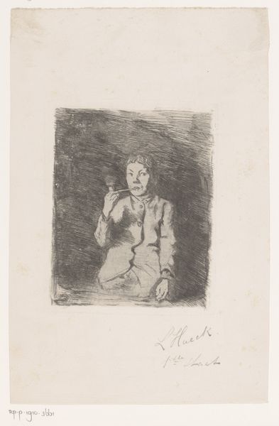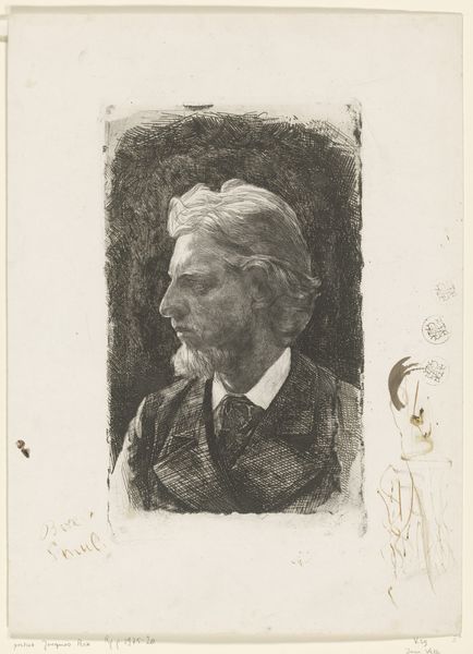 Editor: Here we have Willem Witsen's "Portrait of Hein Boeken," created around 1891. It's an etching, which is interesting, and I find it very moody – quite dark and intense. What stands out to you about it? Curator: Ooh, moody is a great word for it. To me, it feels almost like peering into someone's memory. That hazy, almost dreamlike quality of etching really lends itself to capturing not just a likeness, but a feeling, doesn't it? The lack of sharp detail softens the reality. Ever felt like your own memories get that same hazy treatment? Editor: I get what you mean. It's less a photographic representation and more of an impression. So, it has an impressionistic approach despite the use of realism style? Curator: Precisely! And Witsen's use of light and shadow – those deeply etched areas versus the almost blank space around the face – creates this real drama. Almost a spotlight, wouldn’t you say? Makes you wonder about the character of Hein Boeken, doesn't it? Was he a quiet intellectual, perhaps? Editor: It really does. It’s pulling me in closer to look at that! All that said, given its age and the limited shading, can we be sure that's what the subject truly looks like? Curator: Ah, there's the question of truth! Isn't it delicious to think that art rarely aims for simple duplication, instead being all about interpretation. So in turn, does it show Hein Booken for who he is? Editor: Very well. The more you talk about it, the more intriguing this becomes! Curator: That's the beauty of it, right? It is not what he is, it is who is to us as viewers. Editor: Indeed! Well, I will not think of the Dutch Golden Age with same eyes. Thank you so much for opening my mind to new views on the impressionism style and etching’s potential.