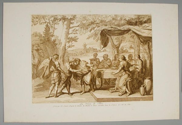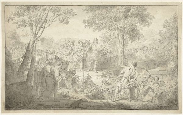 Curator: This engraving, attributed to Bernard Picart, made sometime between 1696 and 1733, depicts "Orpheus Killed by the Bacchantes." Editor: My first thought is: violence. The frenzied energy of the Bacchantes is vividly captured through the dynamic lines and chaotic composition. Curator: Indeed, the print illustrates a critical episode from Ovid's *Metamorphoses,* reflecting shifting social attitudes towards religious ecstasy and communal ritual in the early 18th century. Editor: The contrast between the calm foreground figures and the swirling chaos behind creates a compelling tension. Note the meticulous detail in the rendering of the figures. Curator: The print served a didactic function, intended to circulate moral and historical narratives to a wider audience. It also reveals the influence of classical art. Editor: Absolutely. The diagonal line composition draws the eye from the repose in the foreground through the frenzy in the back. Curator: Examining this work in a broader historical context helps reveal shifting attitudes to art in society. Editor: And close visual analysis can reveal the artist's command of line, form, and composition.
