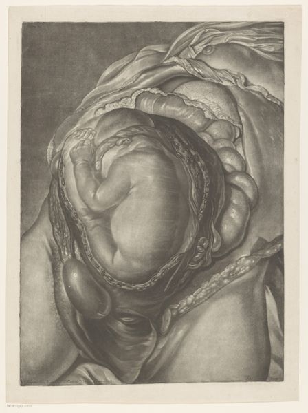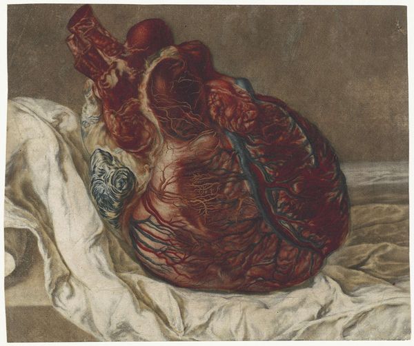 Curator: This print, from somewhere between 1700 and 1750, is entitled "Prints of the Brain and the Heart," and it's attributed to Jan l' Admiral. It's rendered as an engraving. The material details add an intriguing layer. Editor: My immediate reaction is one of slightly uneasy awe. The stark realism of the heart, particularly its exposed ventricles, feels strangely… intimate. Like witnessing a very private moment. It is rather confronting. Curator: Yes, that immediacy resonates. Thinking about this work through a modern lens, one can’t ignore the implications of such literal representation, especially given early modern understandings of medicine and the body and their intersectional association to morality. Editor: It is very visceral. This pairing of the heart with the brain places them as symbols of what, emotion versus intellect, perhaps? The Baroque period certainly favored strong symbolic language. The heart, meticulously rendered, displays every vein, every valve. Is this perhaps a commentary on mortality, a 'vanitas' still life, focusing on these essential human organs? Curator: Exactly. Thinking historically, images of the human heart and brain were of deep scientific and also societal and cultural value. They reflect early attempts at understanding life, death, and identity, especially for bodies deemed “other.” What did this symbol of human organs mean during these times? Editor: This rendering certainly lends itself to the vanitas tradition; that stark portrayal seems meant to invoke our fragility, a visual memento mori. The cloth it lays upon gives me the chills... it's reminiscent of death cloths. Curator: I wonder how these "portraits" are gendered, too. The hyper-realistic texture challenges any romantic ideas about humanity. Who does such an unflinching vision of mortality implicate or absolve, and why? Editor: Reflecting on its symbols now makes it more complex, seeing echoes of the Baroque obsession with symbolism mingling with what feels like a modern awareness of how medical images shape how we view and internalize mortality itself. It all hits harder somehow. Curator: Yes, examining these images reminds me how early anatomy was as much about societal concerns and prejudices as it was about scientific knowledge. Editor: Absolutely. This piece makes me reflect on cultural memory encoded in symbols; how consistently we turn to images of hearts and brains to understand ourselves. It is haunting.
