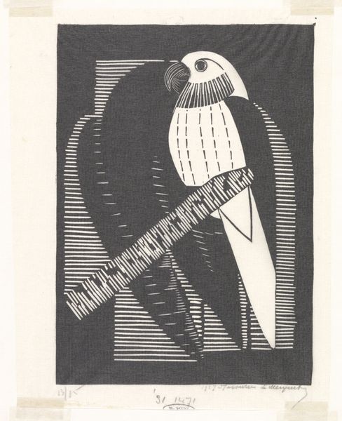 This is Gerrit Willem Dijsselhof's 'Vignet met drie maraboes', created with an unspecified medium, sometime in the late 19th or early 20th century. Immediately, the composition draws us in with its balanced symmetry and simplified forms. Three marabou storks are stylized in solid black against a muted green backdrop. The central bird faces forward, flanked by two others in profile, creating a rhythmic visual pattern. Dijsselhof's approach to form emphasizes the essence of each bird rather than realistic detail. The stark contrast between black and green flattens the image, pushing it towards abstraction. This reduction of natural forms to basic shapes resonates with the broader artistic concerns of the period. There is an engagement with the burgeoning aesthetics of modernism and an emerging fascination with non-Western art traditions. The geometric abstraction and symmetrical composition reflects a departure from traditional representation. It presents the viewer with a new visual language. Consider how the design's flatness and its stylized subjects point to the rise of graphic arts. This piece is part of a shift towards exploring the intrinsic qualities of line, shape, and color.