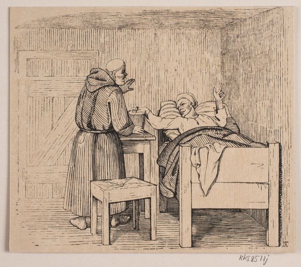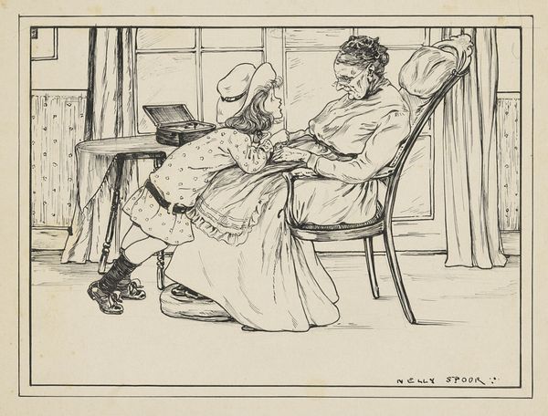 Editor: This is an ink drawing on paper entitled "A Country Mouse," made by Katherine May Roberts. I'm immediately drawn to its narrative quality—it feels like a snapshot of a quiet domestic scene, but I wonder about the story behind it. What do you see happening in this work, particularly in relation to its historical context? Curator: I see this less as a depiction of reality and more as a constructed ideal, prevalent in late 19th and early 20th century illustrations aimed at middle-class families. Notice the meticulous detail of the interior – the orderly bookshelf, the framed artwork, even the carefully arranged tea service. All of these contribute to an image of domestic tranquility that was heavily marketed to create a desire, maybe even an anxiety, in households to achieve this level of 'cultured' respectability. Do you see anything in their poses or attire that strikes you? Editor: The young girl seems almost melancholic, perhaps even bored, which does seem at odds with that idea of tranquility you mentioned. And the woman's clothes... they are rather austere, even for a domestic setting. Curator: Exactly! Roberts, who worked primarily as an illustrator, uses these visual cues to perhaps suggest underlying social commentary. The girl's ennui might be a subtle critique of the constraints placed upon women and children within that idealized domestic sphere, a feeling exacerbated by the social pressure to maintain an outward appearance of perfection. The somber attire, while typical, can also be read as a marker of a certain class aspiration and its inherent limitations. It’s worth considering the commercial aspect of the work as well – was Roberts reinforcing or subverting social expectations? Editor: That makes me rethink the whole scene. What initially felt like simple observation could be seen as a loaded representation of societal expectations. Thanks! Curator: It’s precisely these layered meanings, informed by the historical and cultural context, that make seemingly simple genre scenes so compelling and, ultimately, speak volumes about the public role of art.