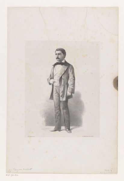 Editor: This is a portrait of Gerard Edouard Henri Malinvaud, made in 1848 by Auguste Raffet. It appears to be a print or etching. It gives me a sense of rigid formality. What strikes you most about this piece? Curator: Beyond the formal portraiture, I see a potent representation of 19th-century masculinity and class. Look at the detailed rendering of his clothing – it speaks volumes about societal expectations and privileges afforded to men of his standing. How do you think his pose reinforces or challenges those expectations? Editor: He does look rather self-assured, doesn't he? I guess that confident stance and carefully chosen attire do convey power. But does it also say something about individual agency during that time? Curator: Absolutely. Consider the revolutions brewing in Europe during 1848. Portraits weren't just about capturing likeness; they were about projecting an image. Who was Malinvaud? Was he part of the revolutionary wave, or clinging to traditional hierarchies? The print, with its capacity for reproduction, potentially allowed this image to circulate and solidify his public identity. Editor: I hadn't thought about the revolutions! It's easy to just see a stuffy old portrait. The act of making and distributing a print suddenly seems so much more… political. Curator: Exactly! Consider how artistic choices always operate within political landscapes. It encourages us to analyze art, not as isolated objects, but as active participants in shaping cultural narratives. How does understanding that impact your initial interpretation? Editor: I now see it as an assertion of identity during a time of huge societal change. Not just a picture of a man, but an active declaration of his place in a shifting world. Curator: Precisely. It shows the value of contextualizing artwork. Editor: This was really interesting! I learned that considering the social and historical context makes artwork far more profound.