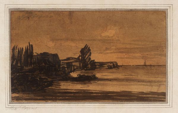 Editor: Here we have Alexander Cozens's "River with Circular Temple, a Man Poling a Boat to Right," from the Tate Collections. I'm struck by how the composition is organized around these distinct masses of land and architecture. What do you see in this piece? Curator: The arrangement of forms is quite deliberate. Note how the circular temple and the craggy rocks create a visual dialogue. The artist uses tonal variations to define the shapes, emphasizing their individual character. How does this formal arrangement affect your reading of the artwork? Editor: It feels almost theatrical, like a stage set. The temple and the rocks are the main actors, and the river serves as the stage. Curator: Precisely. Consider the artist's technique, the washes of ink and the deliberate use of light and shadow, as tools to create depth. These elements contribute to a sense of drama. Editor: I see that now, how the washes build up those contrasts. I'll definitely pay more attention to the techniques used to create those effects. Curator: Indeed, close attention to the formal elements unveils a richer understanding of the artist's intent.