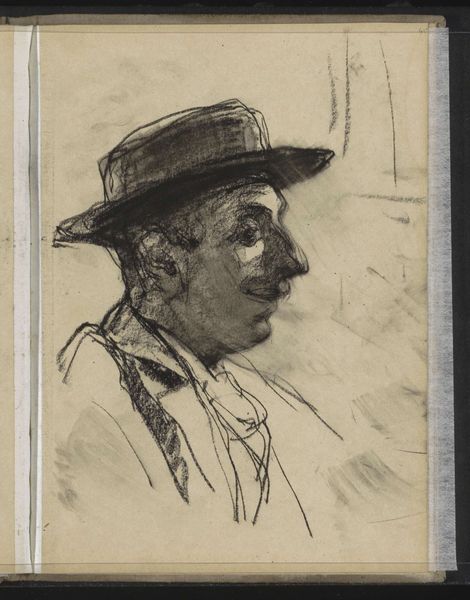 Curator: Here we have Edvard Munch's drawing, Emanuel Goldstein in a Hat, created sometime between 1908 and 1909. It's graphite on paper, quite a striking portrait. Editor: My first impression? There's a wonderful directness to it. It feels like a captured moment, a fleeting glance, almost… confrontational despite the subject's profile. And that hat—it gives him a kind of jaunty defiance. Curator: Absolutely. Looking at the lines, you see Munch working through form and volume so efficiently. It's expressionistic, definitely, but also intensely observant. You can almost feel the pressure of the graphite on the page, how it builds shadow, establishes form. The labor, really, is on full display. Editor: I’m struck by the contrast. The frantic energy in the sketched lines of the suit, fighting for dominance against the still face. Maybe Munch was thinking about control, about inner life versus public presentation. A touch of paranoia, even. Curator: His portraits during this period do reveal anxiety. It speaks to Munch's interest in the inner states of his sitters, or maybe even the industrial world surrounding their time: raw materials, their fabrication. The production process and how it ties to society. The art reflects that industrial mood so well. Editor: Interesting, very interesting. It also reminds me of old silent films, or even earlier cartoons with those simple stark contrasts of dark ink, you can almost hear a rinky-dink piano, can't you? It is more evocative that a literal portrait. It suggests at inner turmoil and a complicated relationship to himself as a subject, but also to the world. It almost asks "who are you to observe ME?" Curator: Well, by reducing form to line, simplifying materials and gesture to essentials, Munch almost dares us to meet that gaze on HIS terms. I would also add that it’s quite economical, in its own artistic and historic terms! Editor: Agreed. You feel Munch digging into the essentials here, material as message and vice versa, even after over a century we find it utterly affecting.
