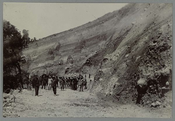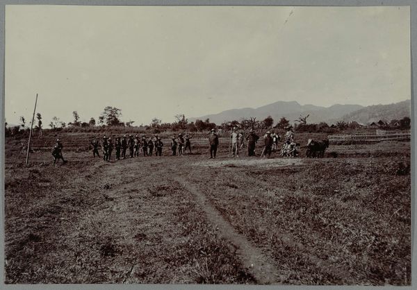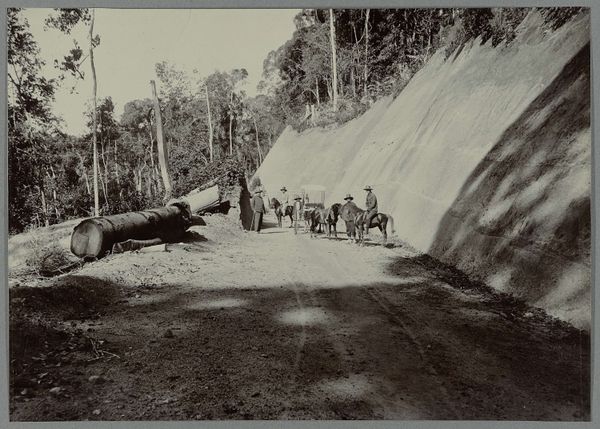 This photograph, "Kruispunt van de nieuwe met een oude weg", meaning "Intersection of the new with an old road", shows us an undated scene by an anonymous maker. We see a group of men standing amid tropical foliage on a newly built road, somewhere in the Dutch East Indies, now Indonesia. The visual codes here speak of colonial enterprise: the road cutting through the landscape, the men – some with tools – posed as if to highlight their labour, and the lack of any indigenous presence. Consider the institutional histories at play. Who commissioned this image, and why? Was it intended to promote progress or to document imperial conquest? What does the absence of a known artist signify? The work embodies the power dynamics inherent in colonial representation. To understand the context, one could delve into the archives of colonial companies, missionary societies, and government bodies. The image's meaning is contingent on these layers of social and institutional history.