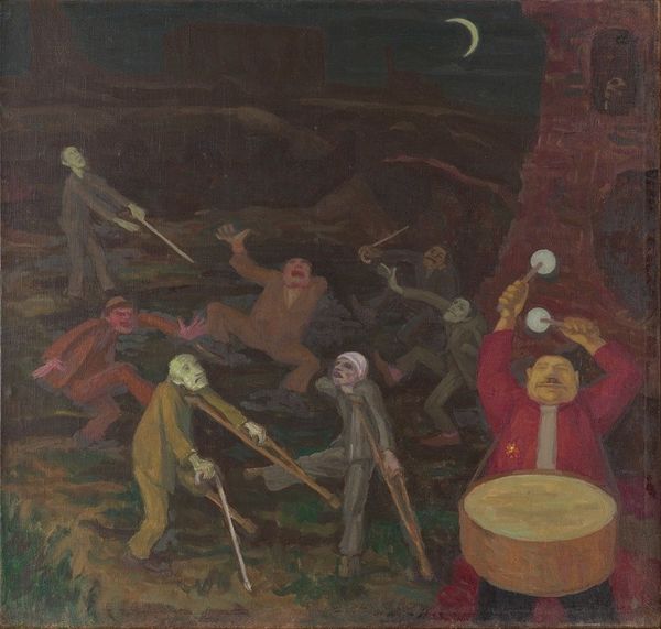 Editor: We're looking at Jozef Hanula's "The Death of Tomory in the Battle of Mohács," painted between 1895 and 1896 using oil paints. It feels very chaotic. What do you see in this piece, particularly from a formal perspective? Curator: From a formalist viewpoint, the dynamism is paramount. Note how Hanula utilizes a high degree of visual incident, crowding the canvas with figures locked in combat. Consider the interplay of light and shadow, designed not so much to illuminate realistically, but to amplify the emotional intensity. The brushstrokes themselves are quite agitated, furthering this sense of unrest. Editor: I notice the color palette is rather muted. Does that have significance formally? Curator: Absolutely. The restricted color scheme—dominated by earth tones and subdued grays—serves to concentrate attention on the formal elements of composition and texture. Observe how the limited color range works to heighten the impact of the few brighter accents within the composition. How does the artist achieve spatial depth and tension within such a constrained chromatic register? Editor: Perhaps through the layering of brushstrokes and the variation in their thickness? The foreground figures have a tangible presence created through visible marks. Curator: Precisely. Hanula's mastery resides in the way he coaxes depth and movement out of relatively simple applications of oil paint. Have you noticed the subtle horizon line and open sky serving as a stark background of the figures battling down below? Editor: That's a clever, compositional touch! Thank you for shedding light on Hanula's piece today; now I know how to appreciate it even more! Curator: A pleasure to use formal techniques for deciphering this rich work.