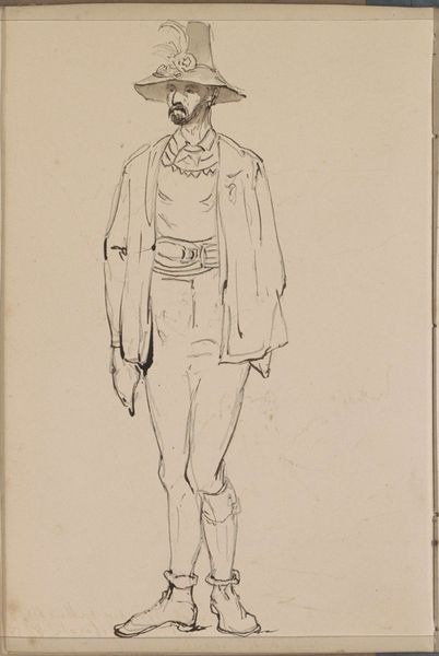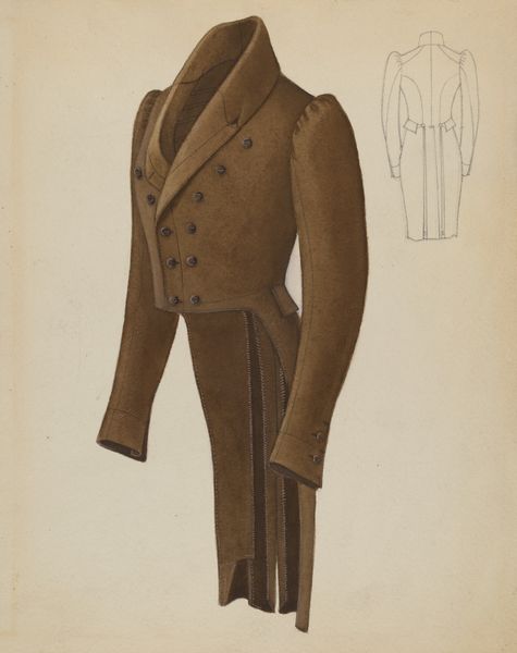 Curator: This charming piece is simply titled "Boy's Suit," and it’s believed to have been rendered around 1939, although we don’t know the specific artist behind this drawing. It seems to be pencil work on paper, probably from a sketchbook. Editor: The meticulousness strikes me; the tiny scalloped trim everywhere. It feels very precious and maybe a little constraining, doesn't it? You can imagine the specific social constraints surrounding what a young boy was expected to wear during that time. Curator: Absolutely, the design is incredibly detailed, focusing on ornamentation which emphasizes the aesthetic values. Clothing and fashion mock-ups provide critical insight to social history. It's fascinating to consider how gender identity, particularly boyhood, was being constructed and performed through clothing at that moment. Editor: Right, and who was designing these clothes? Were they reflecting mainstream ideas, or challenging them in some way? The image becomes more than just a design, but almost a visual manifestation of socio-political forces acting on childhood. Curator: Considering the date, it would be fascinating to explore who created this design and its connections to societal shifts in the role of the family in pre-war or post-war life and also reflect upon what "proper" attire would say about them as perceived members. It also provides us with an artifact of how one sector promoted fashion designs. The role of sketching becomes integral, reflecting values, hopes, dreams. Editor: I agree! This type of piece in museums humanizes historical narratives and is something we can all engage with because everyone gets dressed. If we view something like this as a dialogue around conformity and individualism, suddenly the social expectations have great personal consequence and significance. Curator: Yes, and by looking at it this way, we might gain deeper empathy for those children living then and start to question the impact imposed on today's children, considering their personal journeys while society constantly projects on them, Editor: It prompts us to consider our complicity as participants in the culture, too. Curator: Indeed. These designs have remarkable significance when viewed through a wide socio-political lens, Editor: Definitely a thought-provoking image of the fashion and values of its time, open to so many different readings.