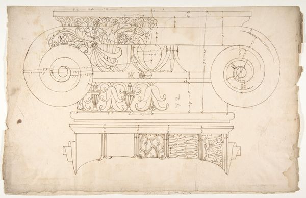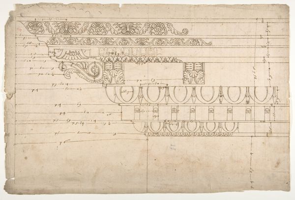 Editor: So, this drawing is titled *Domus Augustiana, cornice, elevation in profile, ornamental detailing*. It’s an etching, dating back to sometime between 1500 and 1560. What strikes me is how precise and technical it looks, like an architectural blueprint, but the ornamental details seem almost dreamlike. How do you interpret this work? Curator: This etching breathes the air of Renaissance aspirations! Look closely – what symbols recur in the cornice design? Think about what a cornice represents: the crowning element, the part that mediates between a building and the heavens. In this drawing, we see repeated botanical motifs. Editor: Yes, like stylized leaves and maybe some floral elements. So you see the ornament like symbols carrying meaning? Curator: Exactly! Renaissance architects saw themselves as reviving the glory of the classical world. Botanical forms were prevalent, signifying renewal, growth, and abundance—virtues associated with strong, flourishing states. It connects this structure, visually, to an idea of sustained prosperity. Note the almost mathematical precision with which these forms are rendered alongside numerical annotations. What do you suppose the relationship is between geometry and aesthetics here? Editor: Geometry provides structure to art, making art precise instead of messy and uncontrolled, perhaps? It feels as though mathematical correctness or rationality is an integral component to beauty during the Renaissance. Curator: Precisely. Now think about the 'Domus Augustiana.' What emotions or values did Roman Emperors associate with architectural details like this? The Romans believed beauty, virtue, and power were interconnected; art reminded those inside what they ought to think, do and value. Editor: So this isn’t just a pretty picture; it’s a representation of power and an idealized image. It brings those distant times so much closer! Curator: Exactly. These seemingly simple etchings allow us to re-enter the mindset of a culture, and connect us through shared visual language.