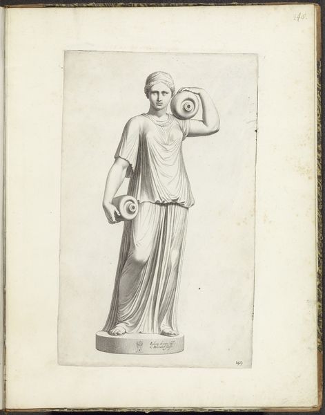 Editor: Here we have Cornelis Bloemaert's pencil drawing, "Statue of a Woman Combing Her Hair," created sometime between 1636 and 1647. It seems quite academic. What are your thoughts on this artwork? Curator: I see here a deliberate rendering, its strength residing in the meticulous application of line and shadow. Note the almost sculptural quality Bloemaert achieves through controlled hatching. Do you perceive a clear sense of geometric form underlying the figure’s pose and drapery? Editor: Yes, the draping is particularly well done, creating almost architectural shapes. How does that structure contribute to the overall effect? Curator: Precisely. This calculated construction of form directs the viewer’s eye, establishing a visual hierarchy. The planes of the body are simplified, distilled to their essential shapes. Observe how this process removes almost all signs of emotion. Does this calculated precision give you insight into Bloemaert’s artistic approach? Editor: It suggests he prioritized idealized form over emotional expression, adhering to classical principles, perhaps? Curator: Exactly. Bloemaert prioritizes line and volume to illustrate form and texture. The technique creates depth and captures the subject's still form within a quiet space. Editor: I’m struck by the level of detail in the hair versus the relatively smooth skin. I hadn’t really considered the formal impact of that contrast before. Curator: Indeed, these deliberate compositional decisions direct the viewer to an aestheticized subject position and encourage consideration of the technical.