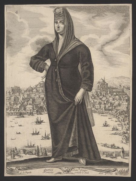 This engraving, 'Femme d'Anvers allant par la Ville', portrays a woman from Antwerp, captured with meticulous detail. Her attire, especially the headwear, is not merely decorative; it speaks volumes of her status and the cultural milieu of her time. Consider how gestures and postures echo across centuries. Here, the woman’s composed stance and clasped hands evoke a sense of modesty, a recurring theme found even in ancient Roman portraiture. Think of the veiled figures in Renaissance paintings or the draped Madonnas of medieval art. This motif of concealment and revelation, seen in the woman’s veil, stirs a deep, subconscious recognition. The symbolic weight of clothing, its ability to both conceal and reveal, speaks to the complex interplay between inner emotion and outward appearance. Like a recurring dream, this woman embodies a timeless archetype, continuously reshaped yet fundamentally unchanged.