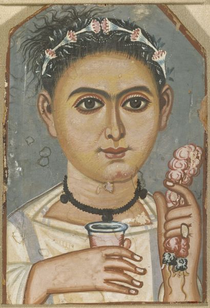 Curator: The portrait we're looking at is a Fayum mummy portrait, currently residing at the Cleveland Museum of Art. Editor: Wow, she's serene. It's like looking into the eyes of someone impossibly removed from the chaos of now. A gentle gaze fixed across centuries, maybe? There's a quiet dignity there. Curator: These portraits were common in Roman Egypt. Painted on wood with tempera, they were attached to the mummies of the deceased, representing a fascinating intersection of Egyptian burial customs and Roman portraiture. Editor: It’s a weird, beautiful paradox. A personalized farewell clinging to the hope of something beyond. Like someone took a snapshot of earthly life, all gilded and crowned, and then…well, you know. Poof! Curator: Precisely. Consider the representation of identity: an Egyptian ritual infused with Roman aesthetics, hinting at a complex society where different cultures mingled. She wears a gold wreath, Roman dress with gold jewelry—status symbols reflective of her social standing within that melting pot of cultures. We need to ask ourselves how race, class and gender are performed in this portrait, and what political messaging this conveys? Editor: I like that idea of performance! Those direct eyes stare me down. She’s like: “Yes, darling, gaze upon my earthly finery…I rocked the toga." There is something playful too; what were her secrets? I want to know more about her real story. She could be a novel heroine. Curator: Indeed. Her “real” story is irrevocably lost to us. Still, as scholars, we can look to contemporary theories about intersectionality to understand the dynamics between Roman colonial rule, religious beliefs, and evolving social customs. Her adornments might reveal more than mere status; they might offer clues to understanding the construction and projection of her identity, beyond just "wealthy Roman Egyptian lady." Editor: This ancient image resonates with me across millennia... as though art somehow conquers death in small and tender doses. Curator: It truly provides an amazing case study. It connects us to those lives, prompting introspection about our contemporary relationship with identity, mortality, and the ever-evolving narrative of the human experience.
