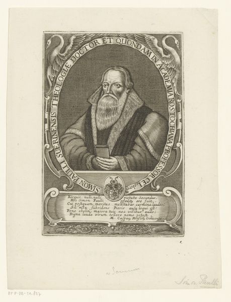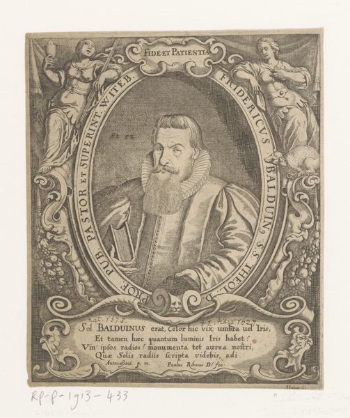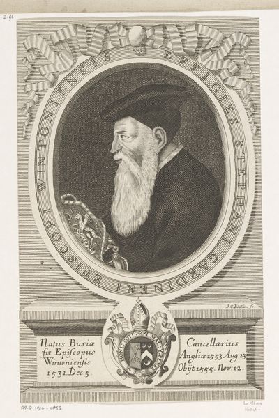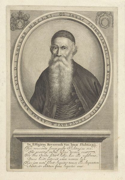 Jean Charles Allet created this portrait of Francesco Marchesi with engraving. The design is dominated by a strong vertical emphasis, which comes from the rectangular frame around an oval portrait, and then a vertically oriented scroll beneath. The subject is centered within an oval frame inscribed with text, creating an immediate focal point. The print employs a sophisticated play of contrasting textures and tones. The face has fine lines that create volume, while the clothing has darker shading to add depth. The linear patterns of the scroll with Latin text create a textural counterpoint to the smooth oval of the portrait. The choice of an oval frame disrupts the conventional rectangular format, softening the rigidity of the lines and suggesting a continuous, cyclical nature. The use of Latin text situates the image within a specific historical and intellectual context. The whole piece invites us to consider how the artist creates meaning through carefully orchestrated formal elements.