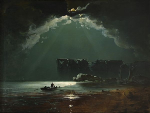 Editor: We’re looking at John Martin’s “The Covenant,” painted around 1843. It’s an oil on canvas and what immediately strikes me is how dramatic the lighting is. It's almost theatrical. What do you see in this piece? Curator: The rainbow acts as a potent symbol, doesn’t it? In Judeo-Christian iconography, it signifies God's promise after the flood, a renewed covenant with humanity. But it's not simply about biblical literalism. Look at how Martin contrasts the luminous arc with the dominating darkness. This interplay hints at more profound psychological themes - hope emerging from despair, order wrested from chaos. Editor: So the rainbow is more than just a rainbow? Curator: Precisely. Martin's work is saturated with visual symbolism, functioning almost like cultural memory triggers. Consider the figures huddled near what seems to be an altar. What narrative threads are woven through this tableau, passed down across generations and manifesting in Martin's canvas? Do you think the sublime landscape overwhelms the narrative, or does it amplify the message? Editor: That’s a great point! The landscape really dwarfs the figures, highlighting humanity’s relative place in a grand, divinely ordered design. But it's more dramatic than serene. Curator: The Romantic era had a fondness for drama. Chiaroscuro and dramatic scale served not merely as aesthetic flourishes but rather as tools to prompt viewers to contemplate their position relative to the world. It's an interesting reflection on what we fear versus what we revere, don’t you think? Editor: Absolutely! It really changes how I see the painting and makes me consider its multiple layers of meaning. Thank you! Curator: My pleasure. These painted testaments can reveal fascinating facets about the times they were created.
