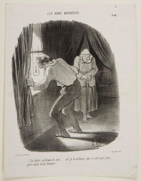 Editor: So this is Honoré Daumier's lithograph, "Thief of a tailor...what bad fabric he gives me...another suit that's shrunk!", and the cross-hatching really emphasizes the… unpleasantness of the situation. What stands out to you? Curator: The print implicates the entire system of production and consumption. Look at the coarse lines, mirroring the shoddy fabric and rushed labor. It's not just a bad tailor; it's a critique of industrial shortcuts affecting the bourgeoisie. Editor: So, it's not just about the one tailor, but the quality of materials and the way things were being made? Curator: Precisely. Daumier highlights the material realities underpinning bourgeois life, exposing the exploitation inherent in cheap goods. Editor: That's a completely different way of looking at it. I hadn't considered the means of production at all. Curator: Considering the material underpinnings offers new insights.