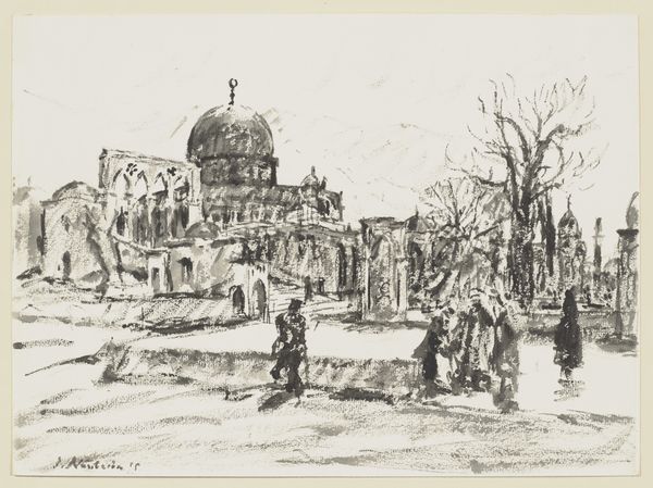 Curator: Before us is "Arches" by Konstantin Gorbatov, an evocative city scene rendered in watercolor, dating from 1935. Editor: My first impression is the hazy atmosphere, a feeling of distance, achieved through subtle layering of tones. Curator: Indeed. Gorbatov's work frequently draws upon orientalist themes, particularly architecture and bustling marketplaces, seen through a lens of Russian impressionism. The "Orient," so often romanticized, provided fertile ground for exploration of cultural difference, power dynamics, and artistic identity for many European artists of the time. How might we understand Gorbatov's place within this discourse? Editor: By looking at his technique, perhaps. See how he uses a limited palette and soft lines. This isn't about precise representation, but more about capturing the essence, a certain feeling, a subjective reading of this place. Curator: Precisely. We must acknowledge the socio-political contexts inherent in his aesthetic choices. For instance, consider the way Gorbatov focuses on the 'exotic' marketplace—a place of transaction but also potential exploitation and encounter, and consider the politics implicit in that gaze. Is he complicit in the orientalist fantasy, or does he offer a more nuanced perspective through the softened rendering? Editor: His technique makes that problematic gaze rather benign. Note the emphasis on composition, on how those arches create a sense of depth, leading the eye toward the minarets and domes in the background. This geometrical framing really dictates how one’s attention flows through the image. Curator: True, and yet we must ask who this ordered composition is designed for. Who is invited to gaze upon and consume this exotic vision? That matters, as it’s often central to understanding the social narratives embedded in the work. Editor: Maybe. But I still think we're giving him too much credit to begin with. Let's keep our minds on his semiotic use of color. He contrasts the cool washes with pops of reds in the foreground that creates an area of strong visual interest—regardless of underlying meaning. Curator: These points, while disagreeing slightly, together add to the appreciation of this watercolor. Editor: It does so for me too, actually.