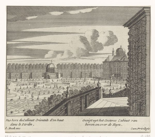 This print of the Catshuis in the Zorgvliet park, The Hague, was made by an anonymous artist through etching. The image's stark contrast is intrinsic to the printmaking process, where lines are incised into a metal plate, which is then inked and pressed onto paper. The sharp, precise lines suggest the etcher was highly skilled, capable of capturing intricate details, such as the formal gardens, the architecture of the Catshuis, and even the cloud formations in the sky. The social context is important here. Printmaking at this time was essential for disseminating images and information, and the choice of subject matter—a stately home and gardens—speaks to the interests and aspirations of the elite. The labor involved in creating such a print, from the initial design to the final impression, was considerable, reflecting the value placed on craftsmanship in this period. By considering the materials, techniques, and social context, we gain a deeper appreciation for the historical significance of this print, blurring the boundaries between fine art, craft, and social record.