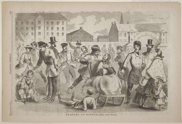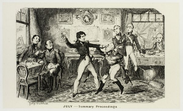 George Cruikshank made this steel etching, titled ‘June - Striking a Balance,’ for the Comic Almanack, a popular British periodical. The image captures a chaotic scene, a mock battle surrounding what seems to be a young couple. The Almanack was a yearly publication that provided astronomical and calendrical data, along with entertaining content. Cruikshank’s illustrations offered social commentary on contemporary life. In this print, the struggle to ‘strike a balance’ likely refers to the challenges of marriage and social expectations, particularly for young couples of the time. The exaggerated expressions and farcical conflict satirize courtship rituals and societal pressures. The surrounding crowd, some cheering and others seemingly injured, adds to the sense of pandemonium and questions the traditional ideals of marriage. To fully understand this image, one might delve into Victorian social customs, gender roles, and popular entertainment. By examining these cultural references, the artwork reveals itself as a critical reflection on the institution of marriage and its place within Victorian society.