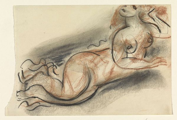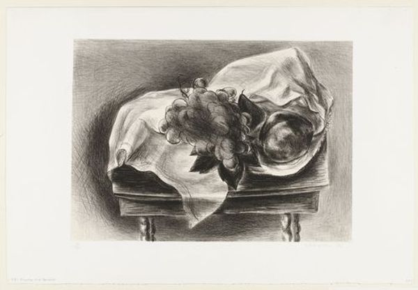Editor: Here we have Yasuo Kuniyoshi's "Still Life - (Peaches and Grapes)" from 1927, rendered with ink, graphite and charcoal on paper. It's a rather somber take on a classic still life. What do you see in this piece? Curator: The severity of this work is striking for a still life, isn't it? Kuniyoshi, as an immigrant artist in America, often explored themes of displacement and identity. Even in something as seemingly simple as fruit, we can consider how cultural anxieties manifested. Does this arrangement of, frankly, common fruit, tell us about American abundance, or a yearning for home? Editor: That's fascinating! I hadn't considered the immigrant experience informing even his still life work. The almost brutal use of shading now makes me think less of traditional art and more about how external social or political influences of America, during that period, played in shaping how it ended up looking like that. Curator: Exactly! And what about the flattening of the picture plane, combined with almost academic shading? Think of the discussions happening then about modernism, and photography's challenge to painting. Where does Kuniyoshi position himself within that debate by utilizing it? Editor: It's like he is purposefully juxtaposing old and new to further prove the identity of America. To see Modernist ideas represented by an artist’s rendering of everyday goods presents new ways of experiencing how American cultural values spread. Curator: Precisely. Considering Kuniyoshi's personal experiences and the broader artistic climate adds layers to this work. I also feel I am starting to view the context and subjectiveness of American identities as one's own. Editor: Absolutely. Thinking about the cultural history transforms a seemingly straightforward drawing into a really poignant commentary. Thanks for that!