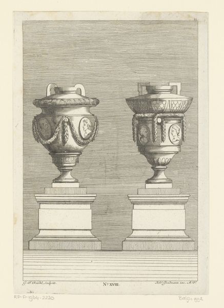 Editor: This engraving from 1778, entitled "Two Urns on Pedestals" by Gottlieb Friedrich Riedel, strikes me as quite austere. The clean lines and symmetry create a very formal mood. I am curious though, how might we understand its deeper significance? Curator: From a materialist perspective, this isn’t just a picture of urns, but a representation of a whole social structure. Think about it: what materials would have been used to create such urns in the 18th century, and who would have been involved in their making and distribution? Editor: I suppose skilled artisans working with clay or marble, maybe even precious metals if they were wealthy patrons. Curator: Exactly. This print allows wider access to decorative art than ever before. The engraving technique itself – the labor involved in precisely cutting the lines, the press used for reproduction – makes these designs accessible, consumable. Would you say that affects our perception of the items pictured? Editor: It's interesting to think about how this print democratized the aesthetic. Were these urns necessarily objects of the wealthy or were prints a way for the emerging middle class to emulate the styles of aristocracy? Curator: Precisely! This is neoclassical design finding new markets. The production and consumption of even an image carries powerful messages. How is taste formed by these prints, and whose labor is essential, yet unseen? Editor: It’s really fascinating to think of the print itself as an object of labor, not just a window onto some grand urn, democratizing access to design at scale. Curator: Right. We’ve moved beyond simply admiring "beauty" to interrogating how its means of production and circulation reflect wider social power dynamics.