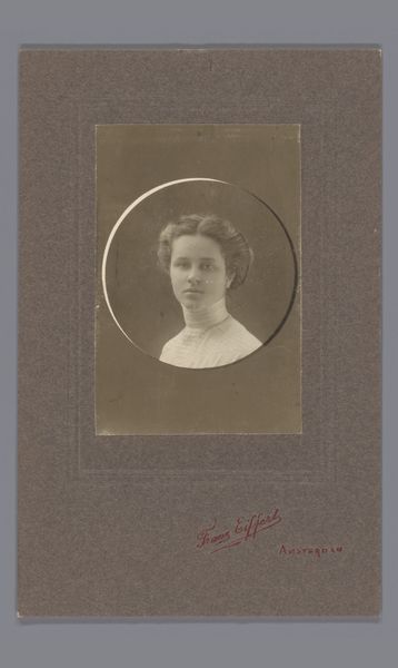 Curator: Here we have a gelatin silver print simply titled "Portret van Johanna Geertruida Jonker," made sometime between 1900 and 1930 by C. Rebmam. What catches your eye first about it? Editor: It's the contrast—the delicate lace of her dress against the solid darkness of her hair ribbons. And her gaze, unwavering and direct, adds to the sense of quiet confidence. It’s very elegant. Curator: I’m intrigued by how much those dark ribbons, almost eclipsing the delicate finery of her collar, create a sort of visual tension. The circular vignette also contributes, focusing our attention on her face, as if isolating a significant figure in the collective memory. It's almost as if the artist wanted the ribbons to signal strength. Editor: I can see that. It seems to mimic her eyes, doesn’t it? Both sets act as points of attention—eyes that peer into a past and present. Looking closer at the way the light plays across her face, however, notice the soft gradation—almost cloud-like. Curator: Yes, and considering the broader context of photographic portraits in that era, one could interpret it as capturing a moment in the ongoing shift in representations of women, from passive objects to active agents. While maintaining classic techniques such as vignette the subject breaks conventions. Editor: The texture also seems important. Looking carefully at the image—especially with her eyes, the jewelry she is wearing—what do they suggest beyond just a realistic record? Are we also encountering some underlying emotional or symbolic weight through the application? Curator: Exactly! Her jewelry, though simple, could represent connections to her heritage, the importance of lineages in a changing world. She could have worn this because it reminded her of a strong bond with other family members, or simply because she adored this necklance. Ultimately we will never know. Editor: That sense of uncertainty surrounding symbols—the necklace and dark hair ribbon against that gentle light—allows an interesting dialogue. Ultimately, this photo offers a poignant space for both formalism and symbolism. Curator: Agreed. It serves as a compelling case study of historical and visual power.