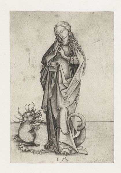 Editor: Here we have Israhel van Meckenem the Younger's "Saint Margaret", an engraving. The detail is incredible! What can you tell me about the production of this print? Curator: Look closely at the lines. Each one was carved into a metal plate, likely copper, a labor-intensive process. Consider the socio-economic factors: who commissioned this, who bought it, and what statement did owning this relatively mass-produced image convey? Editor: It's amazing to think about the labor involved. How does that influence our understanding? Curator: The texture, the line work, all speak to a specific kind of production, and consumption. How accessible would an image like this have been, compared to a painting? The very materiality influences the viewer's relationship with the subject. Editor: I hadn't thought of it that way, but it makes total sense! Curator: Exactly! It prompts us to consider the art market, the rise of printmaking, and their impact on art.
