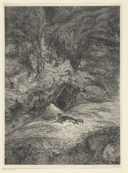 Editor: So, this is *The Hole of Belvaux*, a drawing in ink by Martinus Antonius Kuytenbrouwer, Jr., created in 1853. There’s something really striking about the contrast between the delicate trees and the imposing rock formations. What’s your interpretation of this work? Curator: I see this as more than just a landscape. Consider the socio-political context: industrialization was rapidly transforming the world. The romanticization of nature, especially through the *male* gaze, served as a powerful counter-narrative. Editor: A counter-narrative to what, exactly? Curator: To the dehumanizing effects of industrial capitalism. These "picturesque" landscapes often served as a form of escapism for the rising bourgeoisie, simultaneously masking and reinforcing their dominance over both land and labour. Notice how even the small figures nestled within the rock face only reinforce this. Does their presence seem…exploitative? Editor: Hmm, exploitative. I hadn't thought of it that way. I guess they’re positioned to highlight the vastness of nature, and maybe even the power of nature. Curator: Precisely. Now, let's delve a little deeper. Think about gender. How might a feminist reading of this landscape challenge its supposed "naturalness?" Editor: Well, is it possible the landscape serves as a symbol, or even as an allegory? Like, a mother or something nurturing and all-encompassing that would represent not only feminine form, but a pre-industrial *feminine* past? Curator: Exactly. Thinking about landscape as an intersectional expression of anxieties related to shifts in class, gender, and industry adds layers of complexity. Editor: This really makes me rethink what I thought was a pretty, peaceful scene. Thanks so much. Curator: My pleasure. Let's continue to question the easy readings and unpack the hidden narratives that shape our understanding of art.
