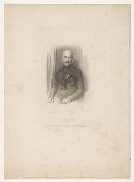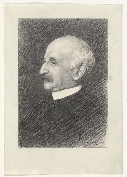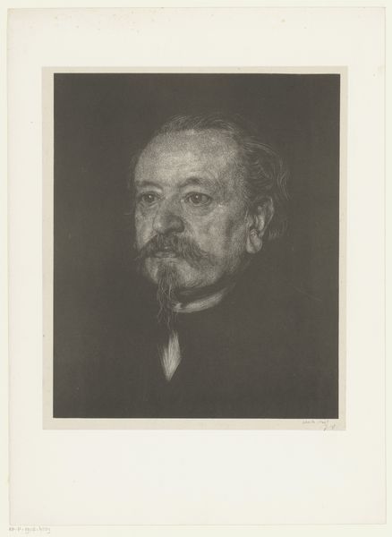 Editor: This is Auguste Danse's 1894 etching, "Portret van Victor Gillieaux, naar rechts," housed in the Rijksmuseum. The meticulous detail is impressive; what strikes me is the textural contrast between the soft, blurred background and the sharply defined facial features. What do you see in this piece? Curator: Formally, the etching operates through a strategic deployment of line and tone. Notice the artist’s calculated use of hatching and cross-hatching. How do these linear configurations articulate volume and depth on a two-dimensional surface? Editor: Well, the fine lines seem to create shadows, giving the face its three-dimensional form and emphasizing features like the eyes and mustache. The background uses a less dense, more chaotic arrangement of lines. Curator: Precisely. Consider, too, how the artist uses the tonal range afforded by the etching process. The subtle gradations from light to dark model not just the sitter's physiognomy but also evoke a specific atmospheric quality. Observe the balance achieved by varying line quality with subtle tonalities. Editor: So, you're focusing on how the artist used specific printmaking techniques to shape the viewer's perception and experience of the work? Curator: In essence. It prompts one to contemplate on artistic skills and formal arrangements of tone and technique that dictate this piece's overall meaning. I wonder if there's symbolic weight implicit within its balanced symmetry? Editor: This new formal awareness really shapes how one approaches similar artwork. Curator: Indeed. Art speaks for itself through composition and process!