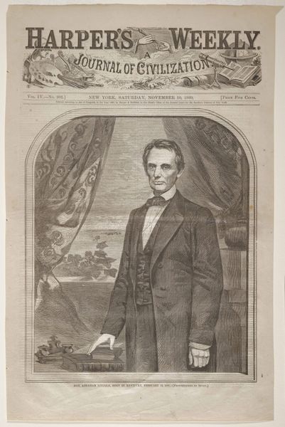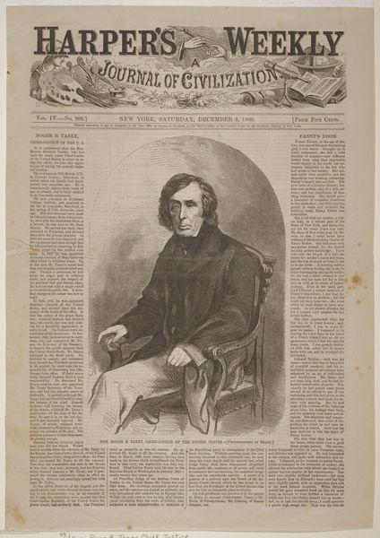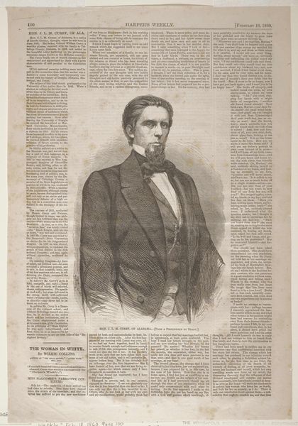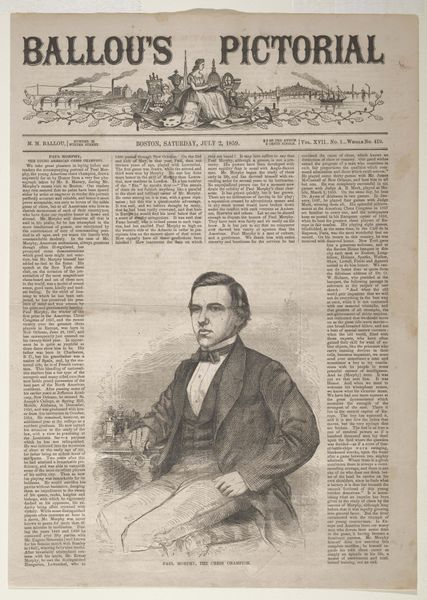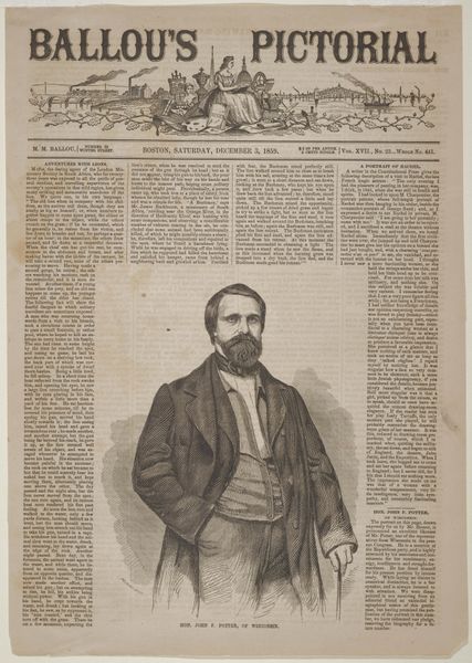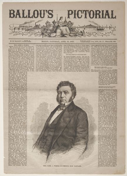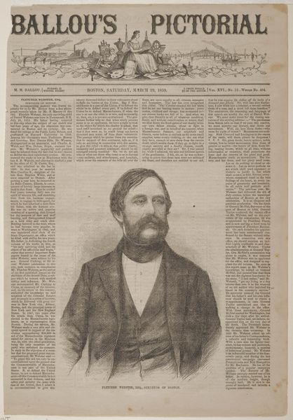 Curator: Alright, let’s delve into this interesting wood engraving. Editor: Here we have Winslow Homer's "Ralph Waldo Emerson" from 1859. It's a portrait, appearing within the pages of what looks like a newspaper. The texture seems quite detailed for a print. How should we look at this? Curator: Let's consider the production of images like this for Ballou’s Pictorial. Before photography was easily reproducible, wood engravings like these were essential for mass media. The lines, the skill… it's not just about depicting Emerson, but about the labor and industrial process behind circulating his image and ideas. Who consumed this, and where? Was this form of readily available portraiture a democratizing force, or did it reinforce social hierarchies? Editor: So, it's less about Emerson the individual and more about the engraving's function in society? Curator: Precisely. The material conditions matter. The availability of the print, the cost, the skill of the engraver - all inform the reading of the image. How do the themes and messages, inherent in the content, contribute to the social and cultural narrative around the subject? Consider, too, how the printing process might affect our perception of Emerson himself. Is the image meant to elevate, or simply inform? What power did these popular prints wield in shaping public opinion at the time? Editor: I see! So it's less about Emerson's likeness, and more about how the availability and means of production shaped his public persona and the way information was disseminated at the time. It really changes the way I look at it. Curator: Indeed. By exploring the materials and the modes of its making and consumption, we uncover so much about the society that produced and received it. It is important to think about not only art but the material circumstances of its production.