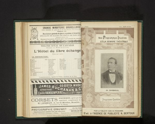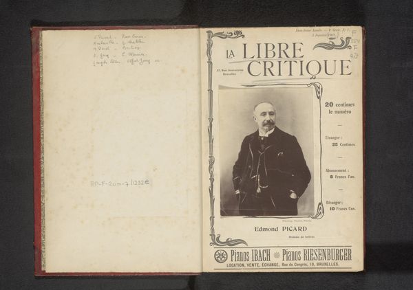 Editor: So, this spread is a photographic reproduction from before 1902 of a drawing alongside three portraits. It’s called "Fotoreproductie van een tekening en drie portretten van sprekers van La Libre Esthétique.” What first strikes me is how modern the layout feels, almost like a contemporary magazine spread, advertising mingling with the intellectual. What do you see here? Curator: You know, it really is a peek into a specific moment, isn't it? That intersection of art, commerce, and intellectual discourse. For me, there's something deeply poignant about seeing these faces – these speakers from "La Libre Esthétique" – caught in a moment before history really got its teeth into them. Does it make you wonder what radical thoughts were brewing in their heads, poised to shake up the art world? I wonder what made them tick; were they fiery, or more cerebral in their delivery, for example? Editor: It does make you wonder, especially seeing them juxtaposed with ads for pianos and chocolate. What's with the Art Nouveau framing around the title, by the way? Curator: Ah, Art Nouveau! A visual hug, wasn’t it? It's trying to elevate the everyday, reminding us that even in newspapers and advertisements, beauty has a place. Perhaps those swirling lines are whispering that art and life are inextricably intertwined, even amidst the clamor of commerce. Do you think it works, though? Editor: I think so. The contrast is intriguing. I wouldn’t have noticed the ads as much without the artistry next to it. It pulls you in. It sort of suggests that consuming can be, in itself, an aesthetic experience, or at least an experience for refined people? Curator: Exactly! That’s the push and pull. And in a way, isn't that what all art does – lure us in with beauty, then prod us to think, feel, and maybe even question our assumptions? It’s quite clever, in a way! Well, it was enlightening to muse upon this with you. Editor: I agree, thanks! I learned a lot about contextual interpretation.
