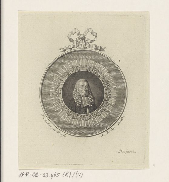 Editor: This is an engraving titled "Rasmus Garboe," created between 1784 and 1785 by J.F. Clemens. It's a portrait set within a circular frame. The print has a monochromatic reddish hue. It looks like it's trying to project authority, doesn't it? I'm curious, what societal aspects jump out at you when you look at it? Curator: Well, I immediately think about the politics of portraiture during the Neoclassical era. The rigid formality, the profile view, even the Latin inscription, all speak to an attempt to project an image of civic virtue and learned authority. Prints like this one, being relatively inexpensive compared to painted portraits, played a crucial role in disseminating images of prominent figures, solidifying their status within the broader public consciousness. Editor: So, it was a form of public relations in a way? Building a brand for someone through art? Curator: Exactly! And Clemens, the artist, was quite skilled at leveraging the clean lines and idealized forms of Neoclassicism to reinforce these notions. Notice the circular frame, like a coin; it's a visual strategy intended to legitimize the subject. Does that framing remind you of anything? Editor: It does have that "official" stamp to it. I see what you mean. What do you think a commoner, perhaps illiterate, might have gotten from this image if they saw it? Curator: Even without being able to read, the visual cues – the dignified profile, the formal presentation, the very *aura* of the piece – would have communicated a sense of importance and societal standing. It highlights the power of images to communicate political and social hierarchies, regardless of literacy. Editor: I never thought about how impactful a portrait, even a printed one, could be on solidifying someone's social position back then. I guess art always has some social implications, doesn’t it? Curator: Absolutely. It's all about understanding the intended audience and the context in which the work was produced and circulated. It definitely gives new appreciation of these portrait engravings.