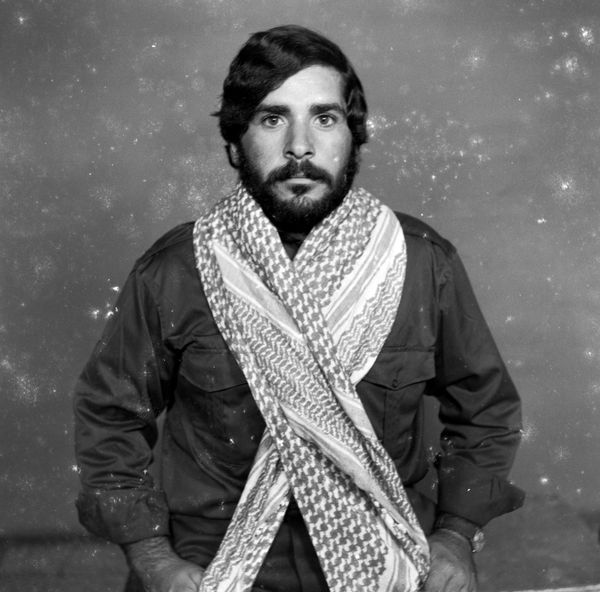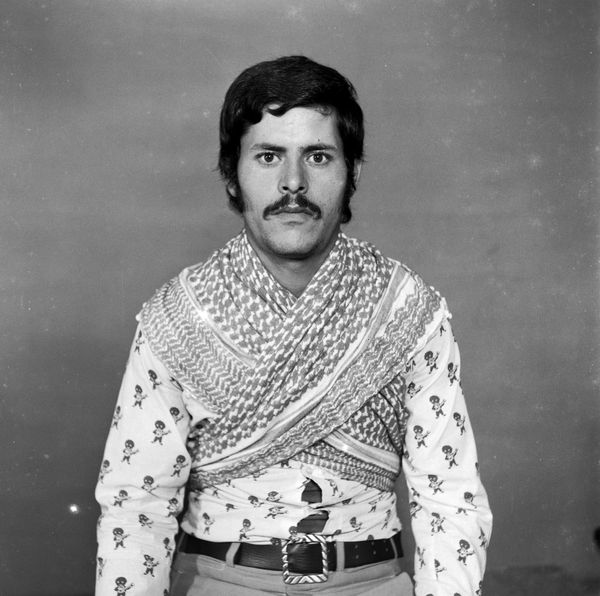 Curator: This arresting image, "Syrian resistant. Studio Shehrazade, Saida, Lebanon, early 1970s. Hashem el Madani," is by Akram Zaatari. It speaks volumes, even without knowing the specific date. Editor: It's striking. The direct gaze and the keffiyeh immediately signal resistance, but there's also a vulnerability present. The photo studio backdrop contrasts sharply with the subject's implied role. Curator: Precisely. Zaatari's work often excavates the layers of identity and representation. The studio portrait, a seemingly simple format, becomes a site of political assertion and self-fashioning. It raises questions about the construction of identity in times of conflict. Editor: The keffiyeh is an iconic symbol, loaded with history. How does Zaatari's approach to this portrait challenge or reinforce those established meanings within the political landscape of Lebanon at that time? Curator: It invites us to consider the individual within the collective struggle. The sitter isn't just a symbol, but a person actively constructing his identity in relation to the ongoing conflicts. Editor: It's a powerful testament to the intersection of personal identity and political struggle. Curator: Indeed. A poignant reminder that resistance is embodied, personal, and always unfolding.