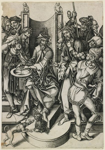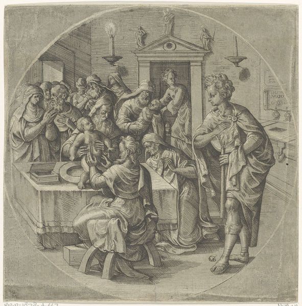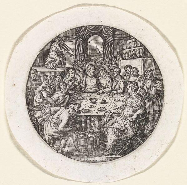 Editor: This is "Episode from the 'Gesta Romanorum': The Emperor and the Page," a pen and ink drawing by Jörg Breu the Elder, made sometime between 1500 and 1537. The detail is really striking, especially given how small the figures are. How do you read this piece, with its busy composition and focus on storytelling? Curator: The composition certainly is packed! Note how Breu uses the circle—the tondo—to focus our eye. It becomes a sort of symbolic lens through which we view the emperor's power. Do you see how the figures are arranged almost theatrically? Editor: Yes, like a stage! The emperor is at the center, but everyone around him seems to be caught in their own little drama. Curator: Exactly. It echoes the *Gesta Romanorum*, a collection of moral tales popular then. Each character plays a role in a didactic lesson, with the Emperor embodying power, but what kind? Think about the objects--the crown, the vessels. What do they symbolize in relation to the Emperor? Editor: Wealth, authority, certainly… But looking at his expression, I also see concern. Maybe power comes with a burden. Curator: A very astute observation. His attire reflects his status, but his face suggests the weight of it. Perhaps this is Breu's way of commenting on the human condition through the lens of Imperial power and morality, mirroring common Late Medieval morality plays. What remains timeless in this symbolism, you think? Editor: It is about responsibilities of power. Seeing it presented this way makes me reflect on how we still grapple with the implications of authority today. Curator: Precisely. And the visual symbols act as cultural echoes, constantly reinterpreted through time. It highlights the continued relevance of narrative and art.