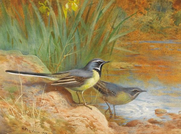 Curator: Here we have Archibald Thorburn's "Rock Doves," created in 1931. It presents two doves perched on a rocky outcrop overlooking a tranquil seascape. Editor: It's rather charming, isn't it? The cool tones of the doves against the warm browns of the rocks create a serene, almost contemplative atmosphere. Curator: Thorburn was renowned for his meticulous depictions of birds, and his works played a role in ornithological studies and wildlife conservation efforts in the early 20th century. It’s relevant to observe the class dimension within British colonial history when looking at wildlife preservation, for instance. Editor: Absolutely. Focusing on materials, notice the detailed brushstrokes which describe the textures of the doves' plumage and the rough surface of the rocks. It's interesting how such a realistic effect is achieved using watercolors. Curator: Looking beyond just aesthetics, how can we contextualize the work's implications on representation? Doves, in a classical European framework, often serve as symbols of peace, fidelity, and the sacred. The specific title suggests the subject isn’t necessarily related to domesticity, perhaps hinting at a critique of confining women in the early 20th century. Editor: I appreciate the observation of that historical implication; but is the application appropriate here? If anything, this makes me ponder the materials needed to illustrate the species and make that identification – the watercolors, paper, brushes. And the socio-economic infrastructure that makes such tools widely available for field research, that enable this pursuit. Curator: Fair enough. It seems we come to art from different needs. While you center on what materials constitute access, I prefer to focus on representation. Do you feel that his representation does not do justice to these living things, their true state of being and existence? Editor: That's not quite what I mean... but thinking about this work through your point of view has pushed me to explore what art represents more holistically. Curator: Similarly, you've challenged my impulse to dive into abstract ideas and reminded me of the essential, grounded act of art making.