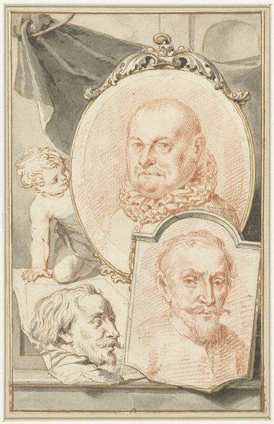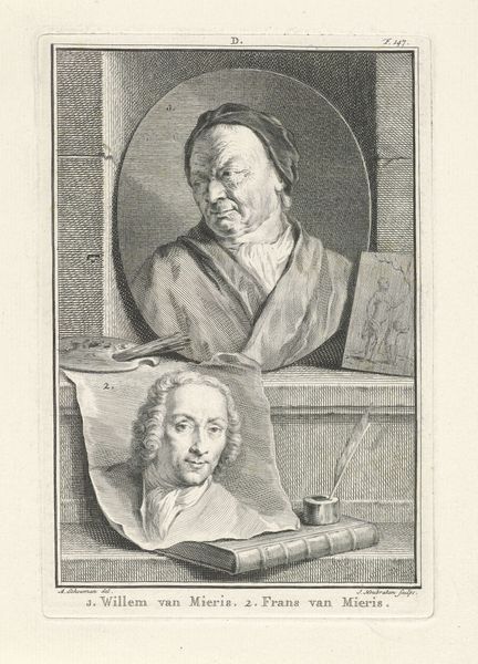 Editor: Here we have Jacob Houbraken's "Portraits of Wencelaus Koeberger and Lucas van Uden," made between 1708 and 1780. It's an ink and pencil drawing at the Rijksmuseum. It’s a little odd – like looking at two artists' busts, unfinished perhaps. How do you interpret this work? Curator: This piece opens a fascinating window onto the social dynamics of artistic representation. These are portraits of artists, yes, but framed as works-in-progress, almost like commodities within the art market itself. Houbraken seems to be subtly questioning the very notion of artistic genius and its representation. Notice how the image’s composition invites us to contemplate how artists gain recognition and lasting power. The portraits almost seem like placeholders – have you ever thought about why we memorialize certain figures and not others? Editor: I hadn't really considered that! So you’re saying it's less about celebrating individual talent and more about critiquing the system? Curator: Exactly. It also encourages us to consider the Baroque period's relationship with the Renaissance, particularly around the idealization of artists and the role of the academy. This drawing makes visible some of the subtle mechanisms of exclusion within the art world. Do you think the unfinished nature of the piece speaks to those mechanisms? Editor: Possibly! Maybe by showing them incomplete, Houbraken suggests they aren't entirely accepted or canonized figures. It's really made me rethink the power structures at play, and the social dimensions that determine how we value art and artists, and who has the agency. Curator: Indeed. Recognizing those structures lets us engage more critically with art history and contemporary art. Editor: Absolutely! It's made me think about who gets remembered and why.