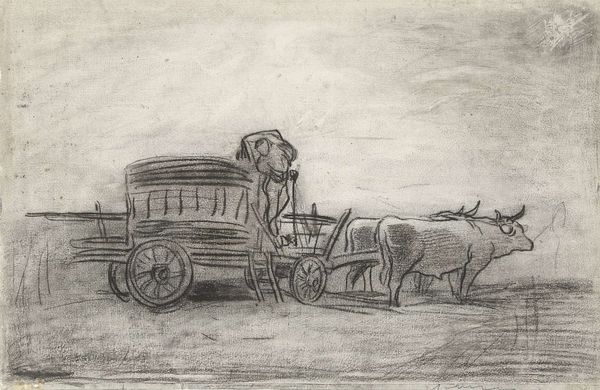 Curator: Here we have George Hendrik Breitner’s “Rijtuig,” created around 1882. It's a pencil drawing currently residing here at the Rijksmuseum. Editor: You know, the moment I saw it, I felt the city. The way the lines capture the carriage's shape—it feels like a fleeting moment caught in charcoal dust. Curator: Pencil, actually. And it’s fascinating how Breitner uses such minimal lines to suggest volume and movement. The carriage itself is structurally sound, the wheels precisely circular, even with the sketch-like quality. Editor: True, but it's more than just structure, isn't it? Look at the driver— barely there, yet he guides the whole contraption! It feels dreamlike, like a half-remembered memory of a bustling street. Curator: It’s this tension between representation and abstraction that’s so compelling. The perspective, although subtly indicated, gives a sense of depth, situating the carriage firmly within its urban environment. Editor: Right. Like a stage setting waiting for a story. And it speaks volumes about the burgeoning cityscapes Breitner was exploring during that time. This piece echoes with the din of carriages and clip-clopping horses on cobblestone streets, doesn’t it? Curator: Precisely. This work can be regarded as a quintessential example of Impressionist-style drawing through his quick notations which document the pulse of city life. The focus isn’t on meticulous detail but on capturing the essence of the scene. Editor: So much implied in so few lines! The beauty is in the suggestion, in the space it leaves for our imaginations. Makes you wonder what he saw just before he put pencil to paper, right? Curator: It does offer a fascinating insight into the artist’s process. Breitner’s reduction of the scene to fundamental forms showcases his mastery. Editor: You’re right! Thanks to that pencil, and to the magic he whipped up with it, this brief ride leaves a mark. Curator: Indeed. A moment immortalized.