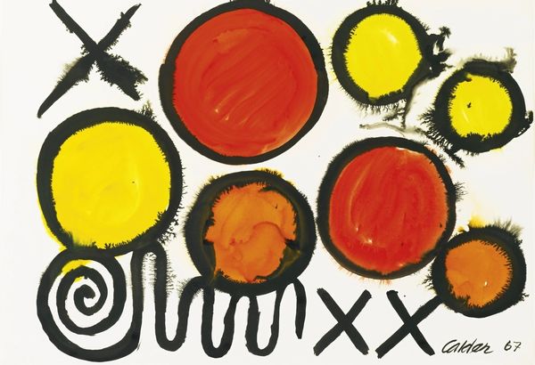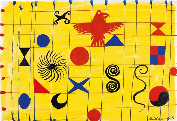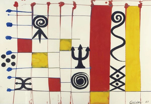 Alexander Calder made this untitled gouache, circa 1965, and it's like looking at a page from a notebook – a playful arrangement of shapes doing a little dance on a grid. The color palette is simple; vibrant reds, yellows, and blues pop against the stark white, like Calder dipped his brush in pure joy. You can practically feel the handmade quality, the gentle bleed of the watercolor on the paper is so present. There's a real sense of improvisation, maybe even chance, in how these shapes are placed, echoing the freedom and spontaneity of his mobiles. I am drawn to the playful, calligraphic lines that end in little red droplets along the bottom edge. It's as if the shapes are about to float off the page, just like the elements in his sculptures float in the air. Thinking of Joan Miró, the work shares that same sense of childlike wonder and an embrace of the absurd. It’s a reminder that art can be both serious and seriously fun, and sometimes, the simplest forms can say the most.