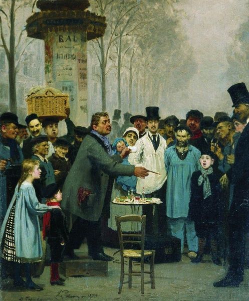 Eugène Boudin created this evocative painting of *The Fish Market, Rotterdam*, using oil on canvas. The composition is dominated by a crowd of figures rendered with quick, gestural brushstrokes, creating a sense of movement and bustling activity. Boudin uses a muted palette of browns, greys, and creams, which evokes the overcast skies and damp atmosphere of a busy market day. The painting's structure can be understood through semiotics: the dark, vertical lines of the trees contrast with the horizontal expanse of the market, while the figures, largely women, are coded with traditional dress, indicating their role and status. The scene captures a moment in time, but also invites us to consider broader themes of labor, commerce, and community. Notice how the artist's loose brushwork and tonal harmonies don't just create a visual impression, but also a commentary on the ephemerality of modern life and the representation of social structures within the urban environment. This blend of formal elements and cultural codes allows the artwork to transcend a simple depiction of a fish market, becoming instead an exploration of space and society.