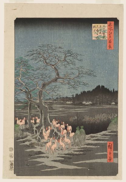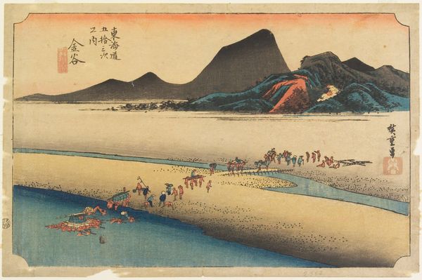 Editor: This is Hokusai's "Hauling the Fish Nets at Dawn in Katase," a woodblock print. The figures are dynamically arranged. What do you see in this piece, especially regarding the physical exertion involved in their labor? Curator: The print highlights the physical demands of labor and resource extraction. The focus on the fishermen's coordinated actions draws attention to the social organization inherent in their industry. How does the materiality of woodblock printing itself relate to this portrayal of labor? Editor: That's interesting! The process of creating the print also involved labor. Curator: Exactly. We see a convergence of the labor depicted and the labor involved in its representation, blurring the lines between subject and object, production and consumption. Editor: I never thought of it that way. Now I see how the materials and processes connect to the themes in the art.